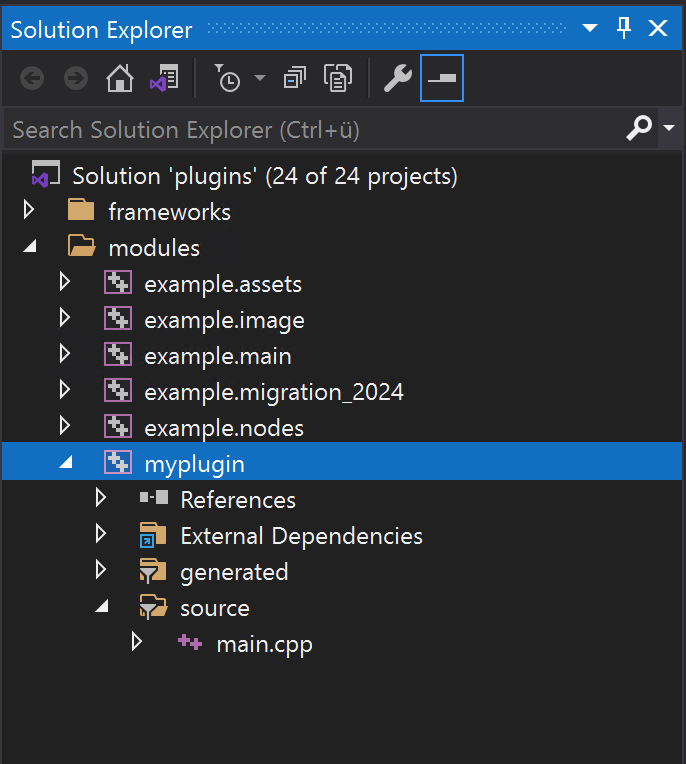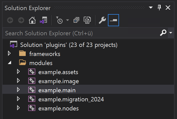 The modules folder in the solution contains the content of the plugins folder of the SDK. Here you find the code examples of the SDK and can also place your own code and projects. When getting started with the SDK, we recommend focusing on the examples.main project in the modules folder as the other projects are about more advanced topics.