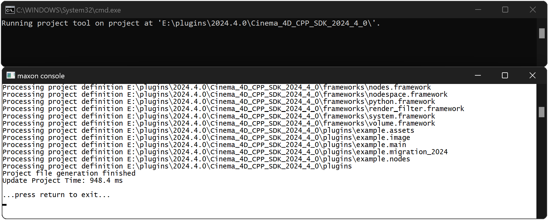 The script will open two windows, the Windows command prompt and the maxon console. The maxon console contains the output of the project tool as it is parsing the solution to create project files. Neither of the windows should contain any errors when the script has finished. Once you see the words '... press return to exit ...' in the maxon console, you can close both windows.