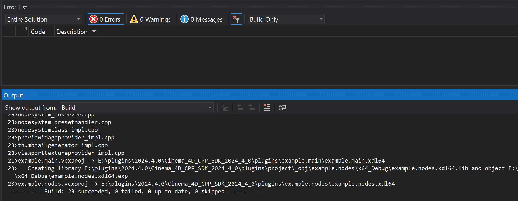 Once the configuration has been selected, you can build the solution by pressing F7 or selecting Build Solution from the Build menu. The SDK now starts building and doing it for the first time can take a while. When the build has finished you can see the message 'Build: XY succeeded, 0 failed, 0 up-to-date, 0 skipped' in the Visual Studio output window. There should not be any failed projects. If there are, the error messages can also be found in the output window. Feel free to ask for help on the Maxon Developer Forum if you encounter any issues.
