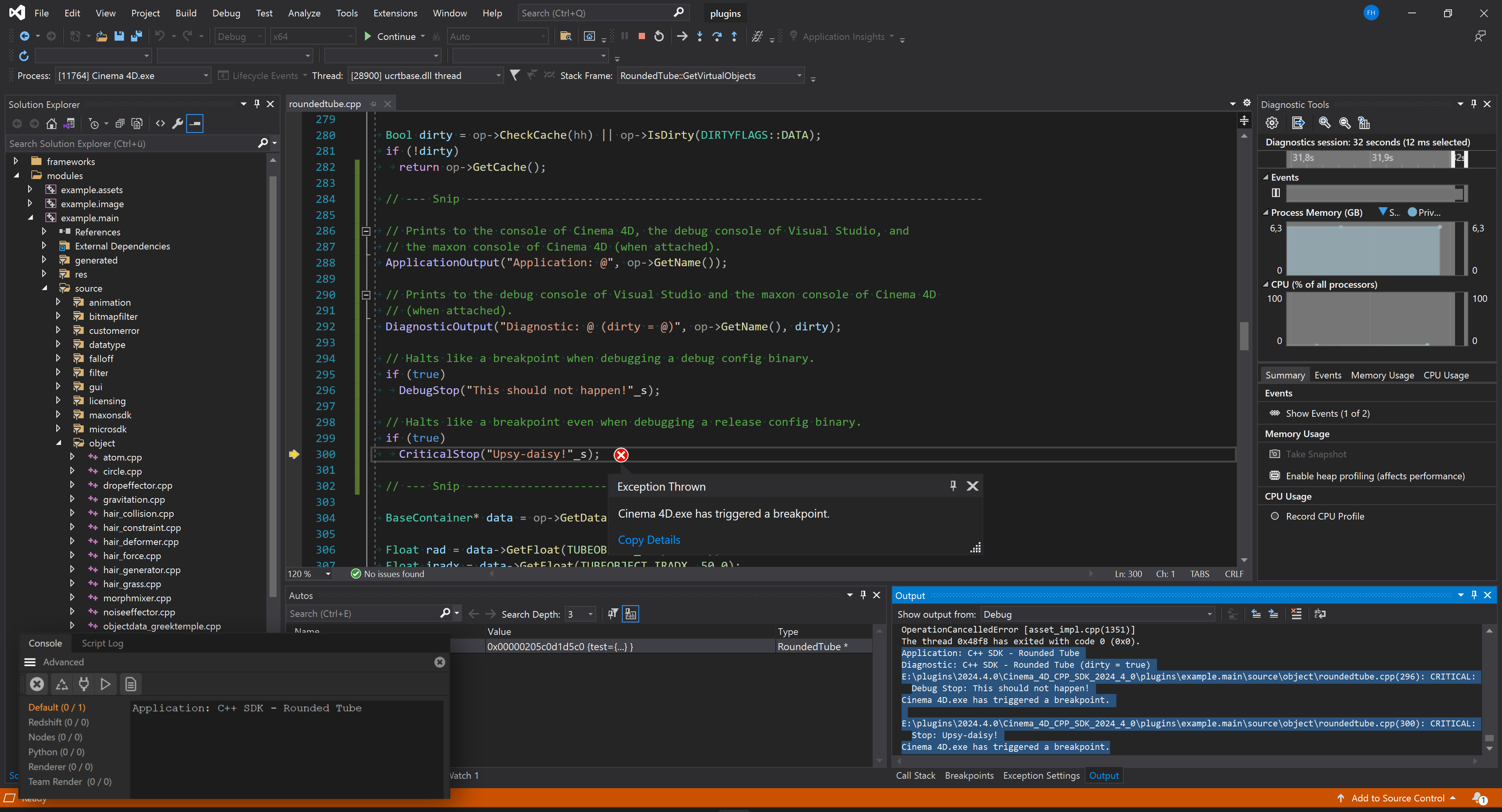 RoundedTubeData::GetVirtualObjects() method while the debugger is running. You can also set a breakpoint when the debugger is not running, we just do it here in one go so that you do not have to reboot Cinema 4D between debugging the SDK for the first time and setting your first breakpoint. Back in Cinema 4D, you can now invoke the Rounded Tube code example from the Commander by pressing SHIFT+C and typing Rounded Tube and then hitting Enter. Cinema 4D will now create an instance of the RoundedTubeData object which will try to build its geometry cache. The debugger will halt on your breakpoint because you have set it in RoundedTubeData::GetVirtualObjects(), the method which is responsible for building the geometry of that plugin.