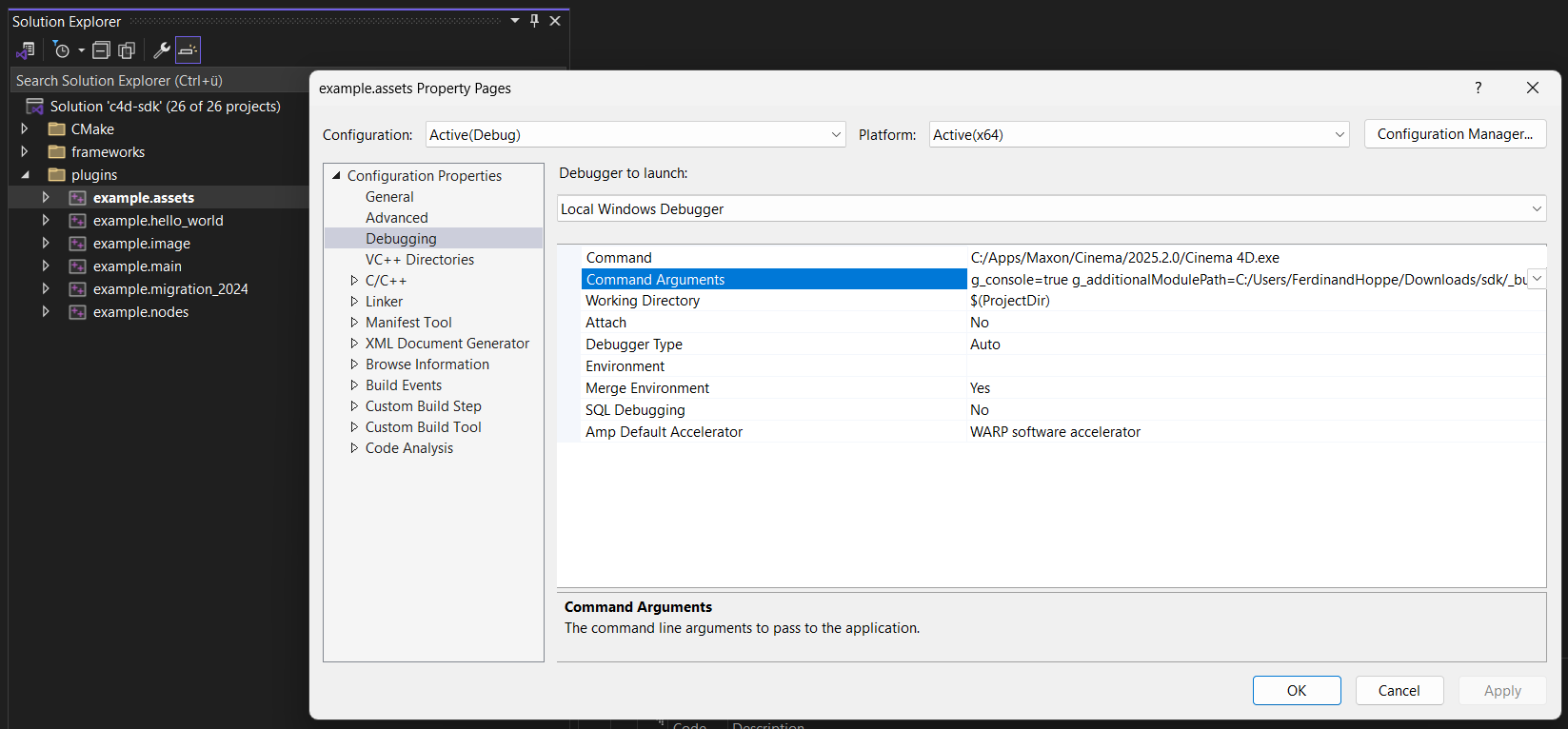 In the project properties, navigate to the Debugging section and set the Command to a Cinema 4D executable that matches the used SDK. When you would now start debugging, Cinema 4D would start, but it would not load your plugin because it would not know that your plugin does exist. To fix this, set the Command Arguments to the string shown below which will tell Cinema 4D to load all plugins in the sdk/plugins/ folder. Alternatively, you could also set the plugin path in the preferences of that Cinema 4D installation.