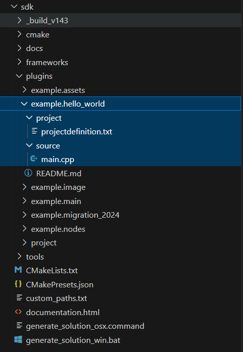Once you have generated a solution with CMake, you can open it in Visual Studio by clicking the Open Project button in CMake. The solution reflects the structure of the SDK and contains all the projects and files that are part of the SDK. The frameworks folder in the solution contains the content of the frameworks folder of the SDK, here you can find the definition of the Cinema 4D API. A framework bundles a section of the Cinema 4D API that is thematically related, the asset.framework contains for example the API for the underlying data types of the Asset Browser. Frameworks are also used to include aspects of the Cinema 4D API with a project, so that the header files of that framework can be included in a source file of that project.