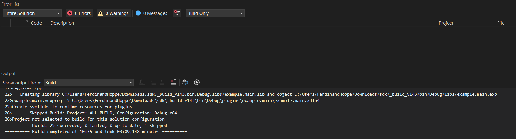 Once the configuration has been selected, you can build the solution by pressing F7 or selecting Build Solution from the Build menu. The SDK now starts building and doing it for the first time can take a while. When the build has finished you can see the message 'Build: XY succeeded, 0 failed, 0 up-to-date, 0 skipped' in the Visual Studio output window. There should not be any failed projects. If there are, the error messages can also be found in the output window. Feel free to ask for help on the Maxon Developer Forum if you encounter any issues.