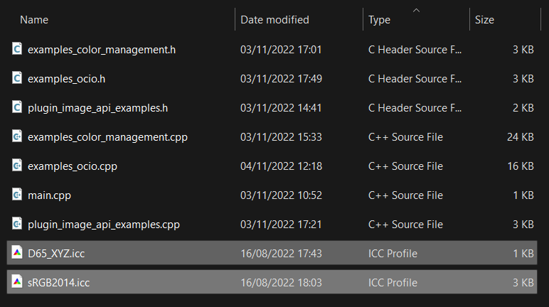 In order to run the Color Management Plugin plugin, one must provide two ICC files named sRGB2014.icc and D65_XYZ.icc in the directory /plugins/example.image/source of the extended SDK (Fig. III ). Any ICC files can be used in principal, but the intended files are the ICC reference profiles sRGB2014.icc and D65_XYZ.icc from www.color.org (last retrieved 08/11/2022).