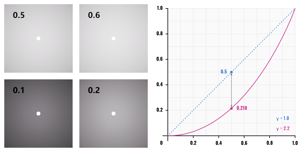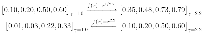 When a set of color values is converted to such non-linear profile, the operation is in non-linear transform, the elements of the converted set will no longer be in the same distance relations as the elements in the original set. Taking the example from Fig. I, the list of greyscale values [0.1, 0.2, 0.5, 0.6] can be converted with a gamma value of 2.2 into values that more closely align with the human perception of these linear values. The first two values 0.35 and 0.48 are clearly separated, while the last two values 0.73 and 0.79 are almost identical, the distance between these two pairs is no longer the same, as the operation was non-linear. In the inverse operation, one can choose a in a non-linear space and convert them to a set of values which would be considered by humans visually linear within a linear space (Fig. II).
