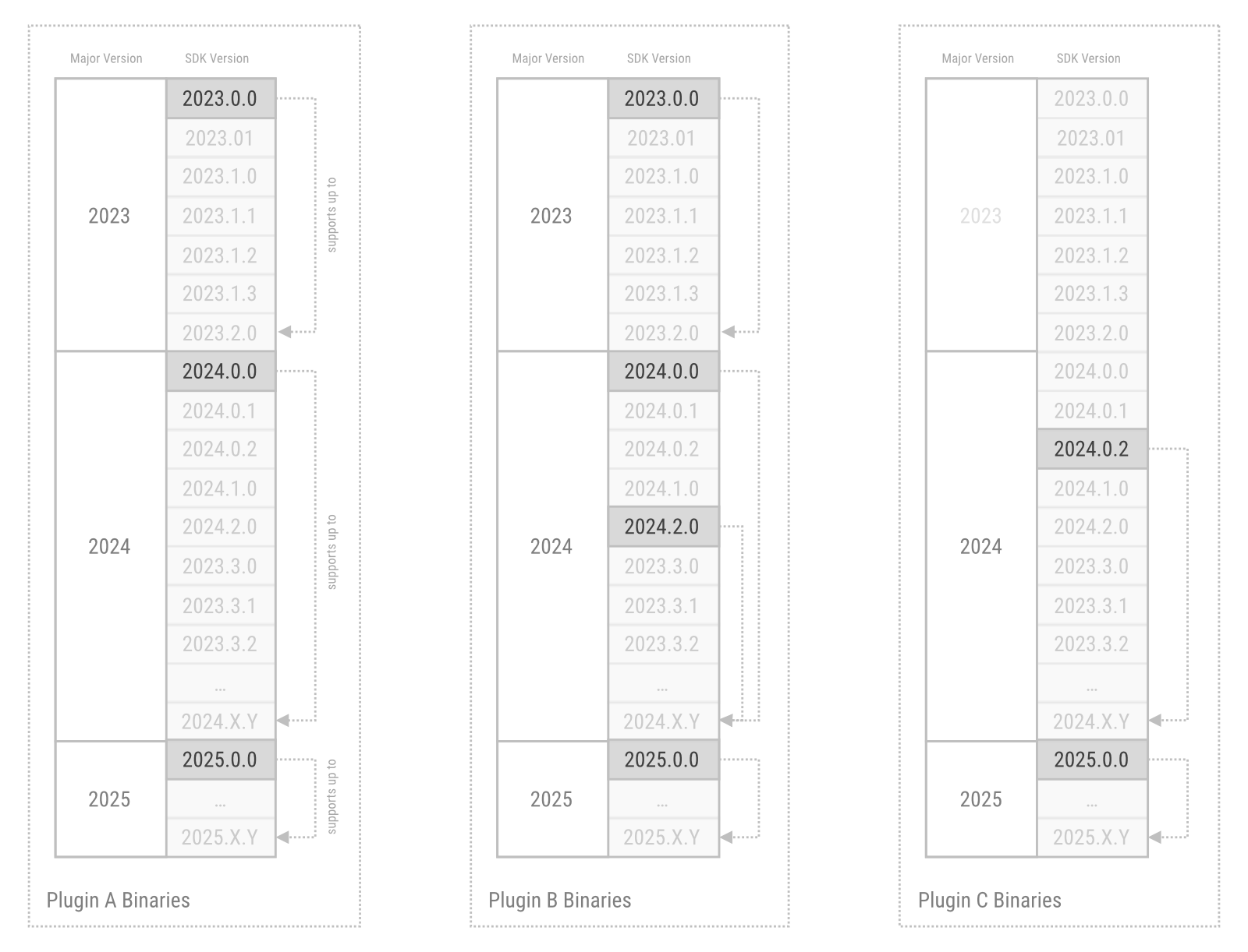 As an example and as shown in Fig. I, the developers of Plugin A always compile their plugin for the first version of a major Cinema 4D release. With plugin binaries compiled with for the 2023.0.0, 2024.0.0, and 2025.0.0 Cinema 4D SDKs, they can cover all Cinema 4D releases of 2023, 2024, and 2025.