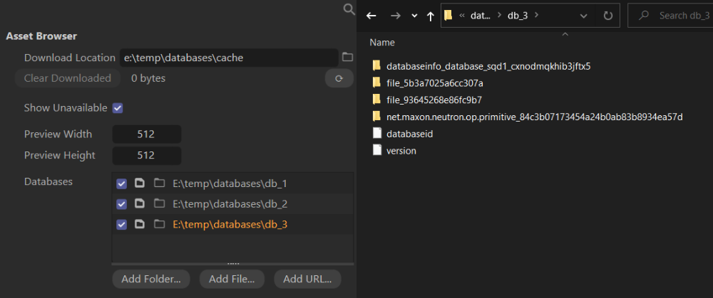 Assets are organized in asset databases and multiple databases can be connected to a running Cinema 4D instance, where each database contains at least the metadata for its assets. Asset databases can also contain caches for their stored data as preview thumbnails and downloaded content. Databases can be added in the Asset Browser section of the Preferences dialog of Cinema 4D, mounting them into Cinema 4D, and making both their primary data, the delivered content, and the associated metadata available in the Asset Browser and Asset API. Asset databases can be enabled or disabled: A disabled database will not contribute its assets and their metadata to the pool of assets accessible by the Asset Browser, but it will still be visible as a mounted database in asset database overview in the Asset Browser and in the Asset Browser Preferences.
