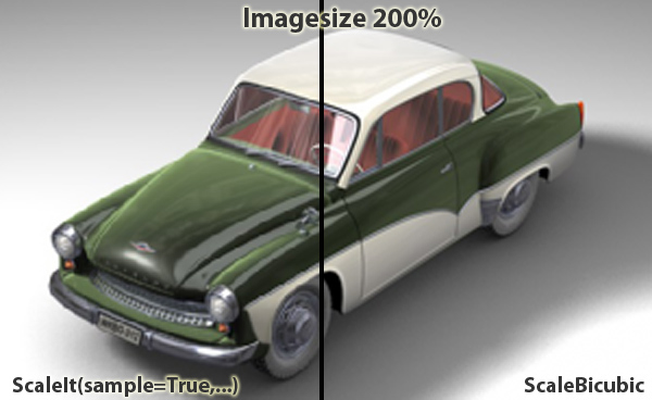 BaseBitmap.ScaleBicubic(self, dst, src_xmin, src_ymin, src_xmax, src_ymax, dst_xmin, dst_ymin, dst_xmax, dst_ymax)¶ - Scales the bitmap rectangle (src_xmin, src_ymin, src_xmax, src_ymax) to fit in the destination bitmap rectangle (dst_xmin, dst_ymin, dst_xmax, dst_ymax) and copies it there.The scaling, if necessary, is done using bicubic interpolation.The destination needs to be initialized before calling this function.