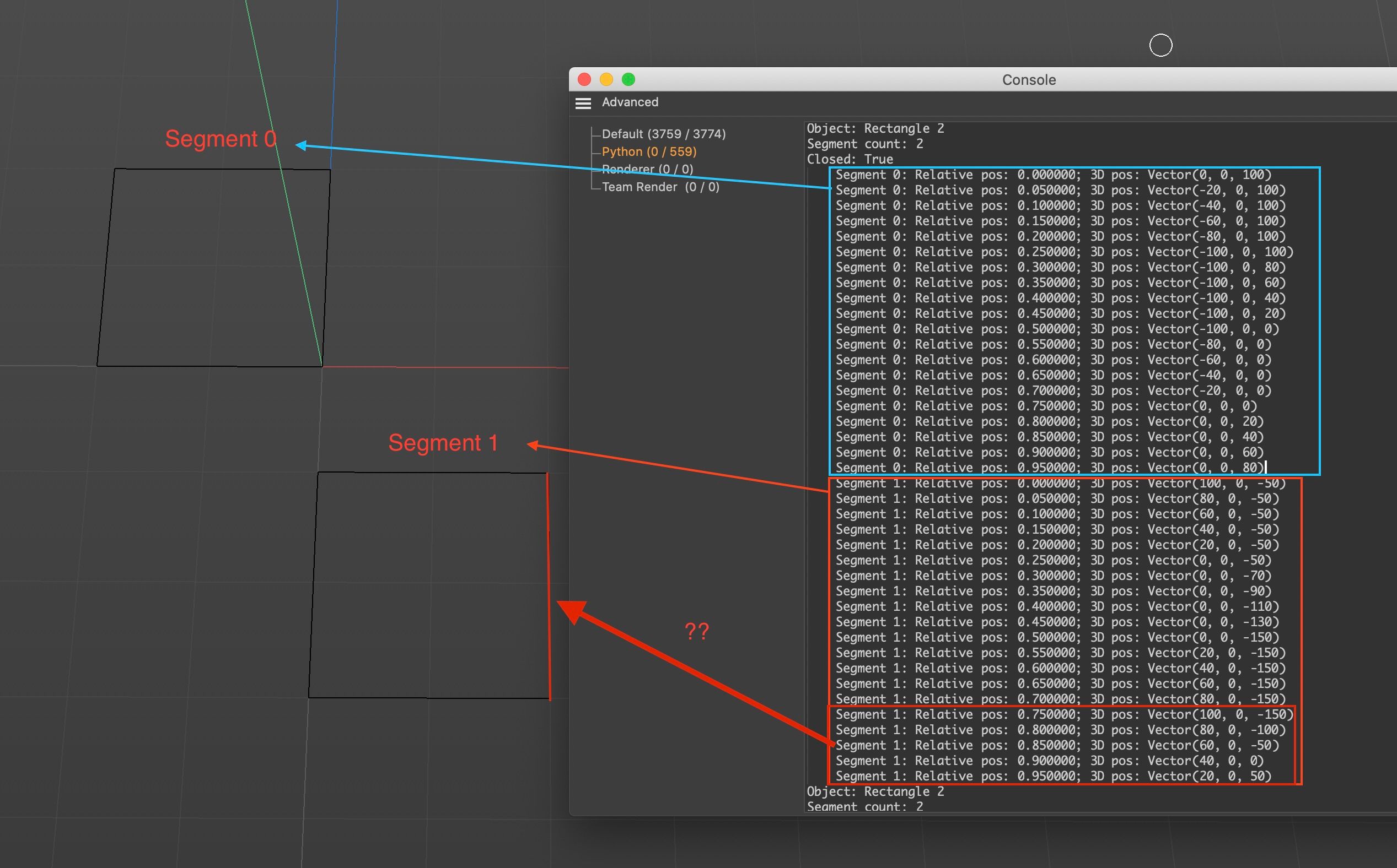 class SplineSampleExample(c4d.plugins.TagData): def __init__(self): self.samplePositions = [] def Execute(self, tag, doc, op, bt, priority, flags): if op.GetType() != c4d.Ospline: return c4d.EXECUTIONRESULT_OK splineHelp = c4d.utils.SplineHelp() if not splineHelp.InitSpline(op): return c4d.EXECUTIONRESULT_OK samplesPerSegment = 20 self.samplePositions.clear() segmentCount = op.GetSegmentCount() realSegmentCount = segmentCount closed = op.IsClosed() if segmentCount == 0: segmentCount = 1 print("Object: %s" % op.GetName()) print("Segment count: %s" % segmentCount) print("Closed: %s" % closed) for segmentIndex in range(segmentCount): for sampleIndex in range(samplesPerSegment): relativePositionOnSegment = float(sampleIndex) / (float(samplesPerSegment) - (0 if closed else 1)) samplePosition = splineHelp.GetPosition(relativePositionOnSegment, segmentIndex) print(("\tSegment %i: Relative pos: %f; 3D pos: " % (segmentIndex, relativePositionOnSegment)) + str(samplePosition)) self.samplePositions.append(samplePosition) return c4d.EXECUTIONRESULT_OKThe result is strange:
