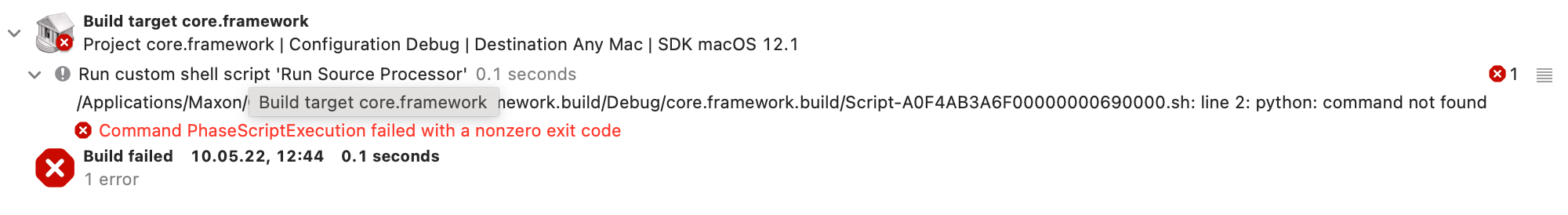 Today, after some time, I tried to build again, and noticed that all builds (all frameworks, too) fail, because "Run Source Processor" build phase can't run. Supposedly, the "python" command cannot be found: