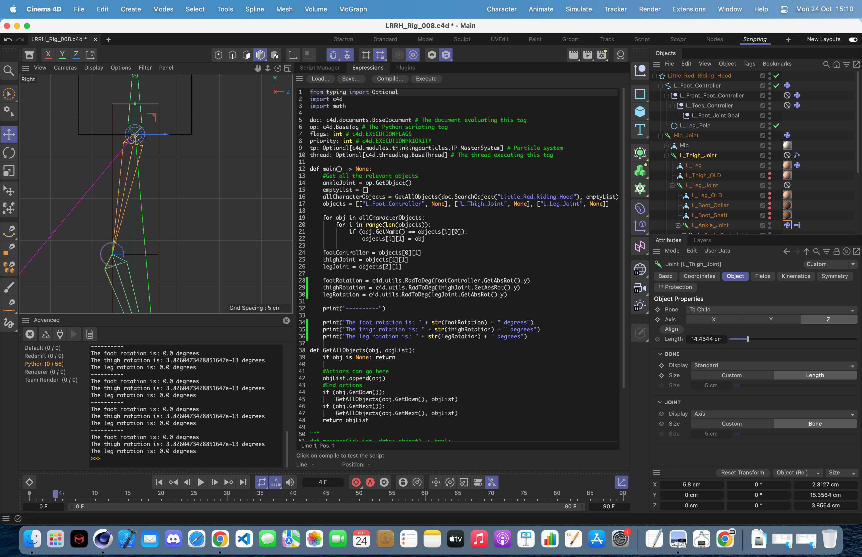 In a character rig I'm currently making, I need to do some calculations with some rotations of specific joints. In one of my python tags I was printing the pitching of the thigh joint into the console, but I got a very strange value (3.82°) while the coördinate manager says it's still at 0°, no matter if I view it in absolute, relative or world mode. Also, as soon as the thigh joint gets rotated (due to the hip joint moving downwards, or the foot controller moving upwards), the value changes from this weird angle, to the correct one. So it is working, as long as my thigh joint isn't at 0°, which it is at the start of my setup. Needless to say that I want it to work when it is 0° as well.