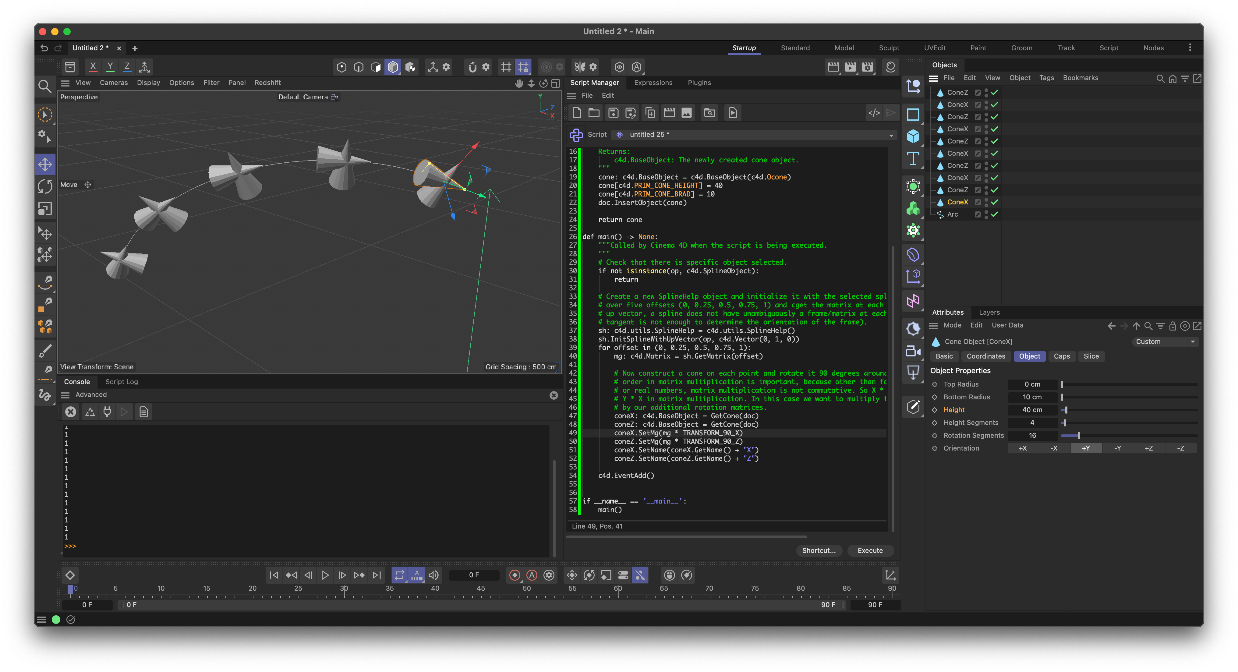 """Constructs cone objects on the selected spline object at five different points and rotates them by 90 degrees on their principal X and Z axes. """ import c4d doc: c4d.documents.BaseDocument # The currently active document. op: c4d.BaseObject | None # The primary selected object in `doc`. Can be `None`. # Ninety degrees in radians and two pre-built matrices for rotating 90 degrees around the X and Z # axes. The Y axis is not too useful here since a cone is symmetrical along its Y axis. RAD_90_DEG : float = c4d.utils.DegToRad(90) TRANSFORM_90_X : c4d.Matrix = c4d.utils.MatrixRotX(RAD_90_DEG) TRANSFORM_90_Z : c4d.Matrix = c4d.utils.MatrixRotZ(RAD_90_DEG) def GetCone(doc: c4d.documents.BaseDocument) -> c4d.BaseObject: """Creates a new cone object. """ cone: c4d.BaseObject = c4d.BaseObject(c4d.Ocone) cone[c4d.PRIM_CONE_HEIGHT] = 40 cone[c4d.PRIM_CONE_BRAD] = 10 doc.InsertObject(cone) return cone def main() -> None: """Called by Cinema 4D when the script is being executed. """ # Ensure that there is an editable spline object selected. if not isinstance(op, c4d.SplineObject): return # Create a new SplineHelp object and initialize it with the selected spline object. Then iterate # over five offsets (0, 0.25, 0.5, 0.75, 1) and get the matrix at each offset. A spline does not # have unambiguously a matrix for each offset since a normal and a tangent of a point only define # two out of the three degrees of freedom. The matrices which are constructed here are in respect # to the #upvector we pass to the SplineHelp object. sh: c4d.utils.SplineHelp = c4d.utils.SplineHelp() sh.InitSplineWithUpVector(op, upvector=c4d.Vector(0, 1, 0)) for offset in (0, 0.25, 0.5, 0.75, 1): mg: c4d.Matrix = sh.GetMatrix(offset) # Now construct two cones on each point and rotate them 90 degrees around the X and Z axes. # The order in matrix multiplication is important, because other than for example the natural # or real numbers, matrix multiplication is not commutative. So X * Y is not always equal to # Y * X in matrix multiplication. In this case we want to multiply the spline point matrix # by our additional rotation matrices. We already operate in world coordinates, with #mg, # so we do not need to multiply by the matrix of the spline object itself. coneX: c4d.BaseObject = GetCone(doc) coneZ: c4d.BaseObject = GetCone(doc) coneX.SetMg(mg * TRANSFORM_90_X) coneZ.SetMg(mg * TRANSFORM_90_Z) coneX.SetName(coneX.GetName() + "X") coneZ.SetName(coneZ.GetName() + "Z") c4d.EventAdd() if __name__ == '__main__': main() -
