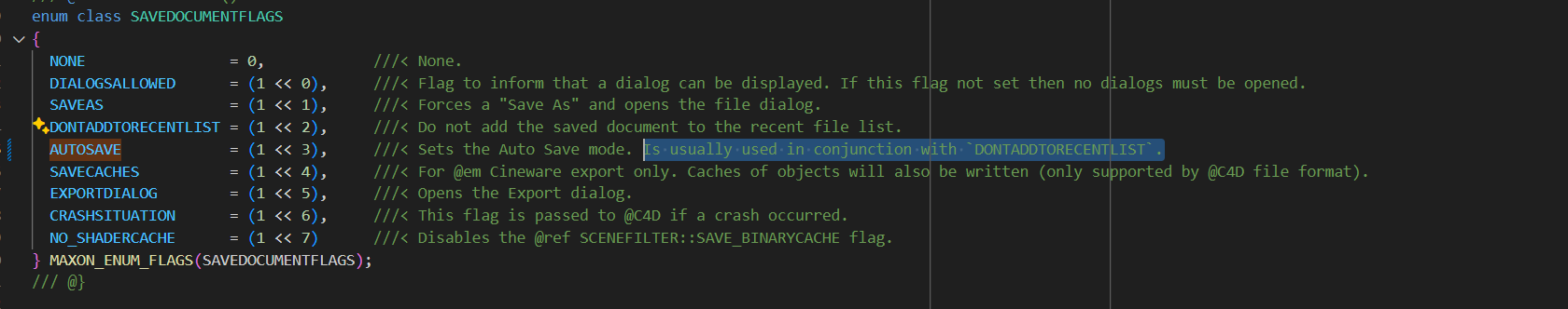 SAVEDOCUMENTFLAGS::DONTADDTORECENTLISTto determine if it should put a saved document into the recent list or not. So, I would say it is fairly safe to assume that our documentation simply degraded there a bit. I have removed the bit onSAVEDOCUMENTFLAGS_AUTOSAVEwhich talks about the recent file list.