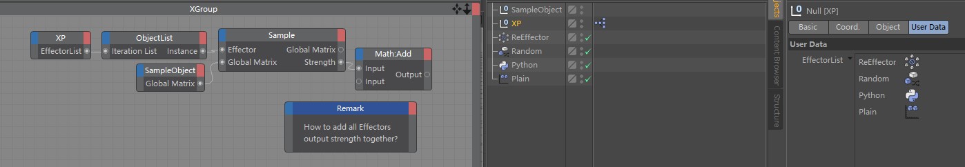 The problem I faced is a little bit complex than this: I need sample Effectors' total Output Strengths in the position from a Polygon Object's Points, and store the result into a Vertex Color Map attached for further use.